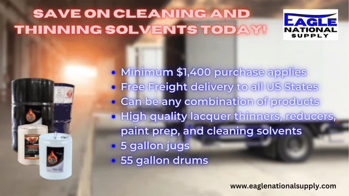 Looking to save some money on your high use thinning and cleaning solvents? Take advantage of discount pricing on drums and 5 gallon jugs of our high quality lacquer thinners, paint preparation solvents, and urethane paint reducers. Free freight delivery to all US states. Minimum purchase applies. Shop today while supplies last!